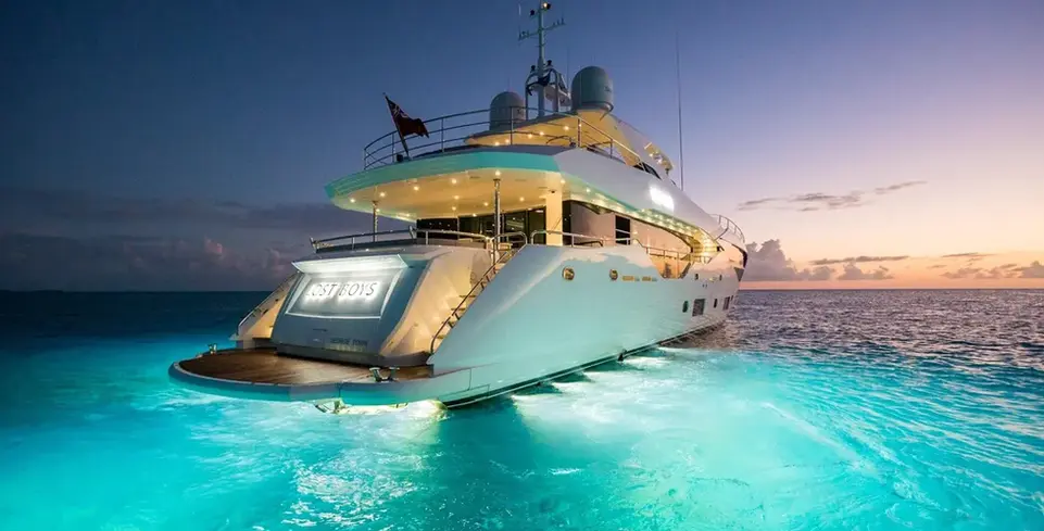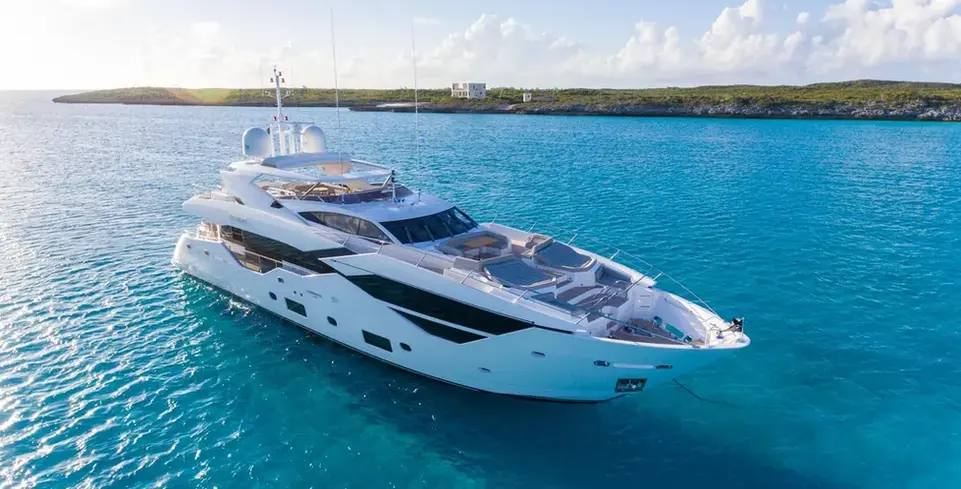 This stunning 2017 Sunseeker 32m motor yacht boasts a modern and luxurious exterior profile that is sure to turn heads in any marina. With its sleek lines and expertly crafted hull, this vessel is as stylish as it is functional. The exterior features a striking white gel coat that shines brilliantly in the sun, complemented by silver and navy blue accents that enhance its nautical appeal.