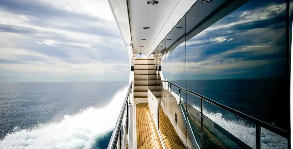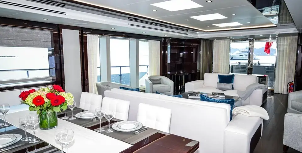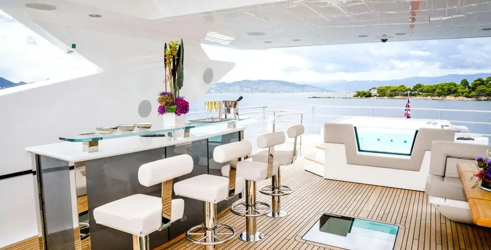 A spacious flybridge offers panoramic views and is outfitted with plush seating, sun loungers, and a well-appointed wet bar featuring a refrigerator and sink, perfect for entertaining guests. The hardtop includes an easily retractable canopy, providing versatility for sun or shade as desired. The expansive cockpit area is ideal for al fresco dining, boasting an elegant dining table with comfortable seating surrounded by large windows that allow for abundant natural light.
